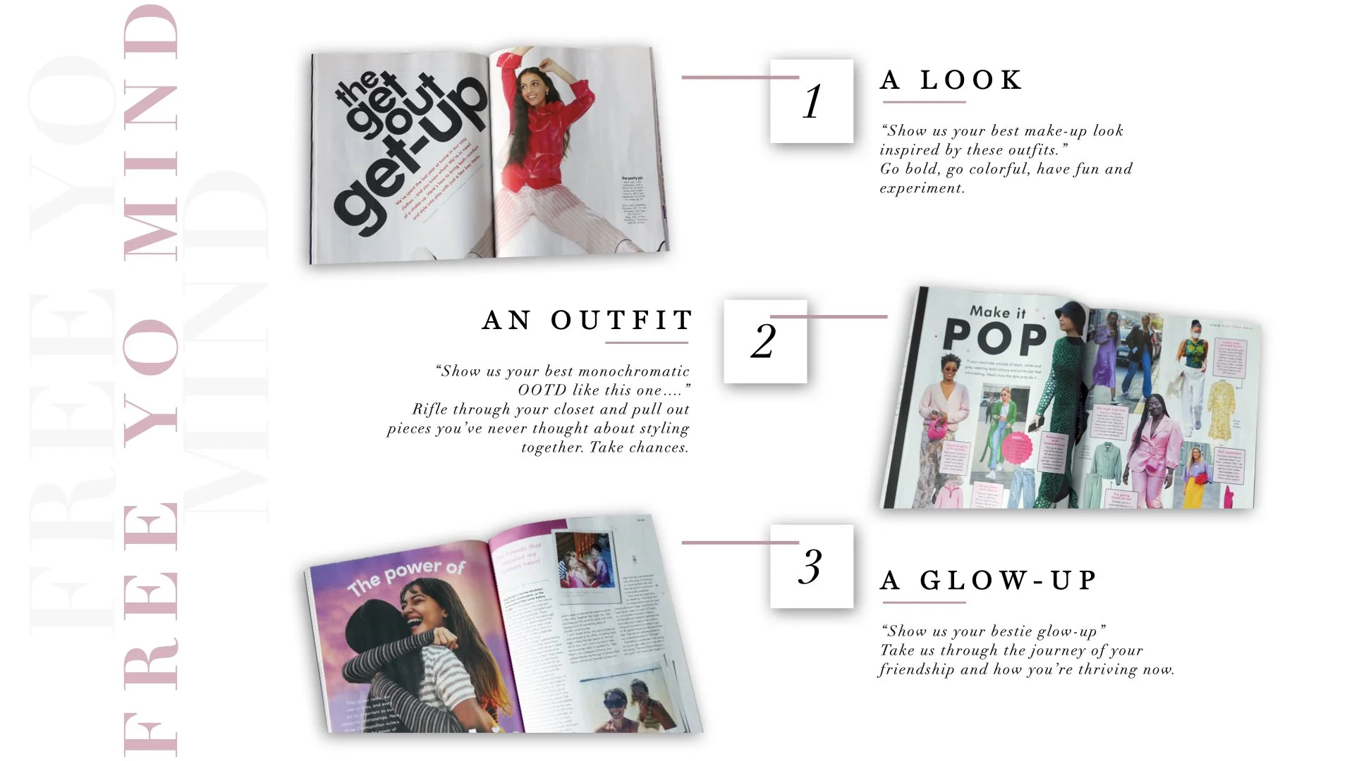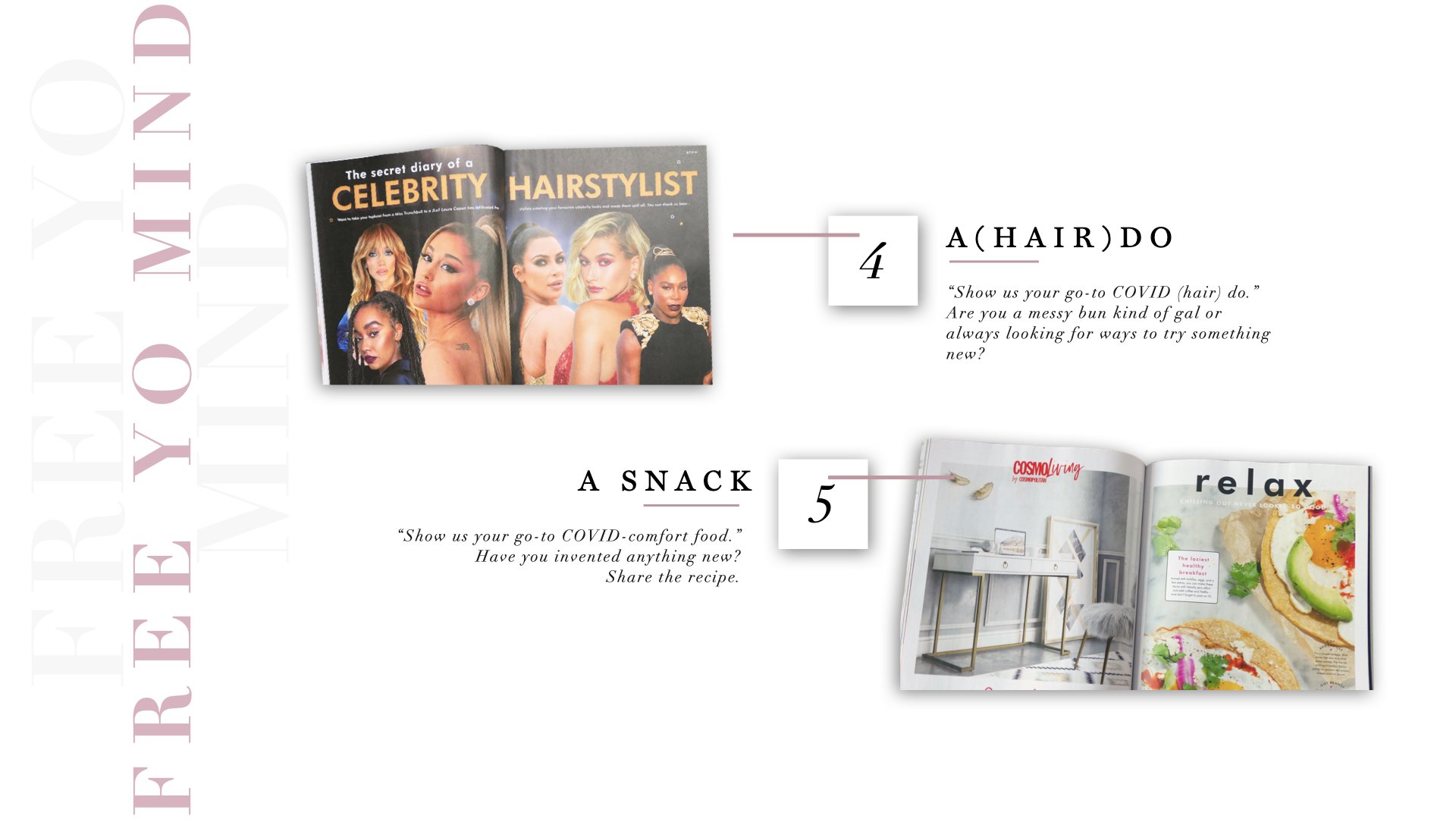 Before settling on an idea, I thought about how everyone has been feeling since the arrival of COVID. The three main “symptoms” being exhaustion, repetition, and just a general mind funk. Spending all day on the computer, in meetings and sessions can really becoming exhausting. It’s harder to think of new ideas and get inspiration from the confines of your house. We’re creative beings but currently our creative juices aren’t flowing. This led me to an idea to help them get started.I knew I wanted to focus on Cosmopolitan magazine so I began by taking a look at their social channels. It was then that I decided to focus on Instagram. I created a SWOT analysis analyzing their current content and thought it would be interesting to have a campaign focused on bridging the gap between the physical magazine and everything posted on Instagram. When I first started thinking about the prompt, my mind went to the phrase “Free Your Mind” since our minds (and bodies) have been sedentary in our homes. The campaign would allow the Cosmo audience to create content relevant to each issue’s articles. Once doing whatever the contest asked of, the contestant would have the opportunity to win a COVID- appropriate themed and once in a lifetime prize. As far as the theme of the campaign, once I had the name “Free Your Mind”, it only seemed natural to finish the phrase in the same tune as En Vogue’s song. “Free your mind and the rest will follow” -- "Free your mind, and let Cosmo inspire!” I broke up the contests into five different themes (each with their relevant article). And finally, to keep in line with the COVID theme, I thought it would be fun for the winners to have a meet and greet/zoom call with celebrities.