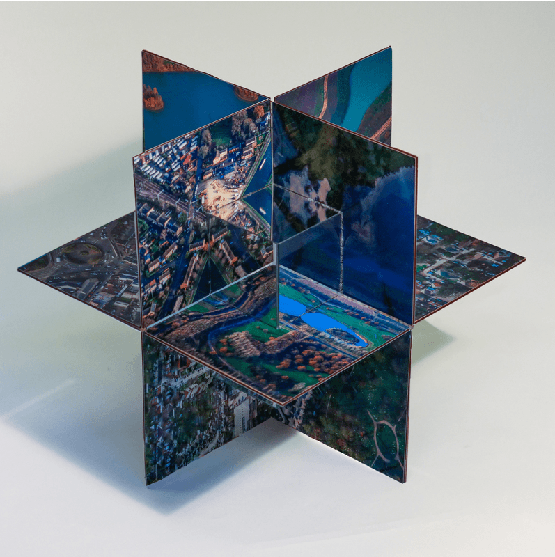 After reaching out to a local aero club, I was given full access to take a ride in one of their Cessna’s, on a short trip in the air, to tour Cambridge. Balancing three cameras and four lenses, I shot as many beautiful landscape photos as I possible. I was careful to photograph both architecture and land, making sure to get as much variety in textures and colors as I could. After my feet were securely on ground again, I edited the photos down to the best and decided to go a bit rogue with my idea. The common way to document photos is in a traditional album, but since my photos were taken from an unconventional angle, I wanted my work to be displayed in an unconventional manner. After choosing my favorite images, I laser cut “L” shaped plywood to adhere my images on top of. And with six 8”x8” mirrors, I formed a cube for the images/plywood to attach on. This unique shape, along with the mirrors, created an amalgamation of terrain and architecture, giving the viewer an interesting way to view Cambridge.