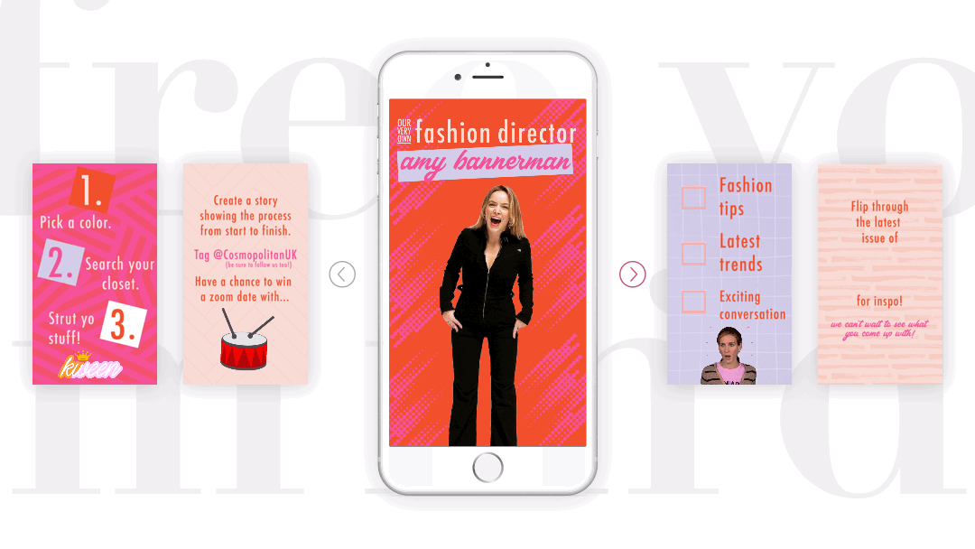 During the final term at CSVPA, I was one of six students chosen to receive a Hearst UK mentorship. In order to win the elusive mentorship, all students were to compete. With the prompt of “Design a product that can help people get more out of life during lockdown,” my winning idea was a social campaign meant to release Cosmopolitan readers from the monotony of everyday life during COVID. The campaign was meant specifically for Instagram stories and let the readers reminisce, create, inspire and embrace specific articles throughout Cosmo’s monthly issues and bring them to life in individual contests.